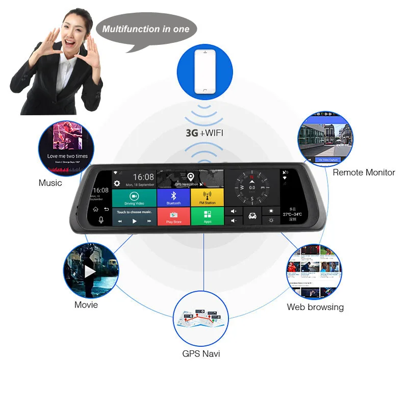 10 Inch 3G Android 5.1 Car DVR Touch Dash Cam Rearview Mirror Dash Camera Dual Lens GPS Navigation