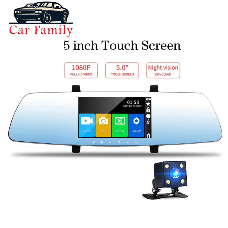 Full HD 1080P 5 inch Dash Cam DVR Dash Camera Rearview Mirror Touch Screen Dual Lens Video Recorder