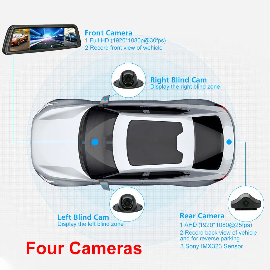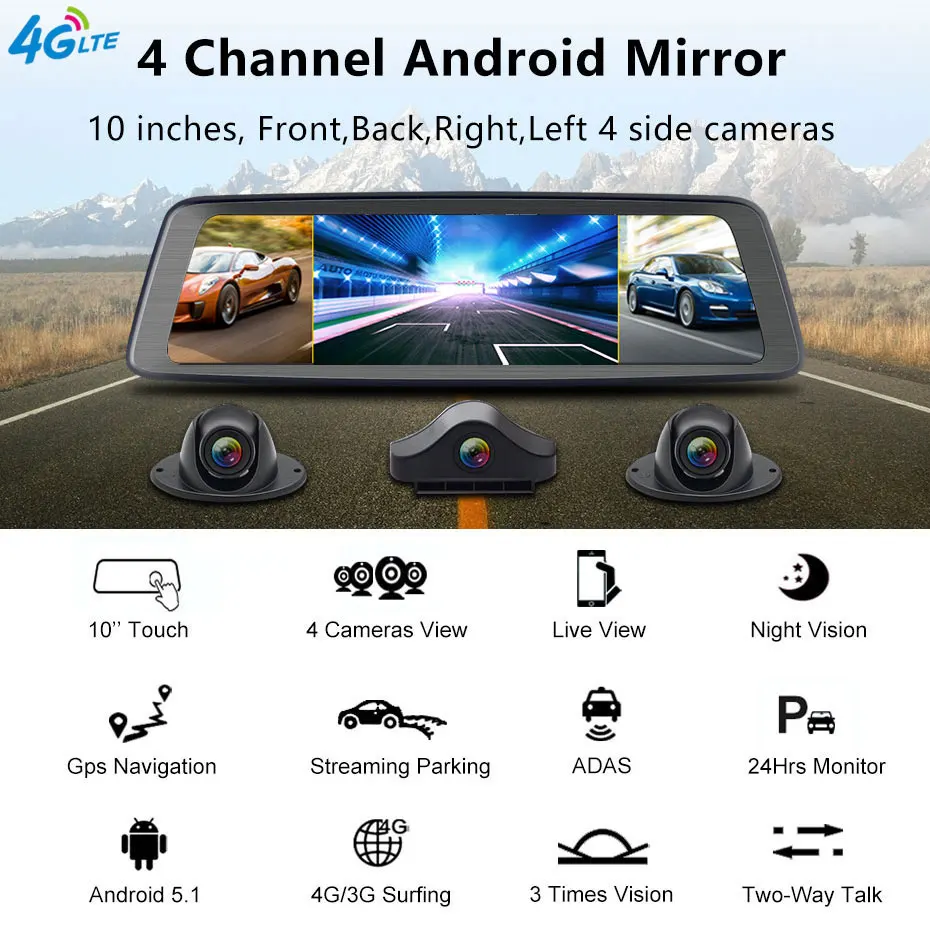 Olysine 4 Channel Car DVR Camera 10" Touch Stream Media Mirror ADAS WIFI GPS Dash Cam Android Navig