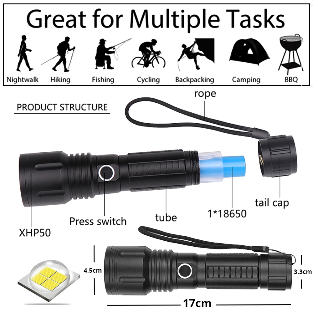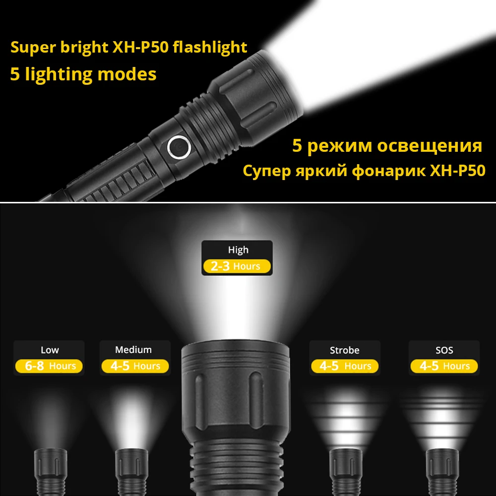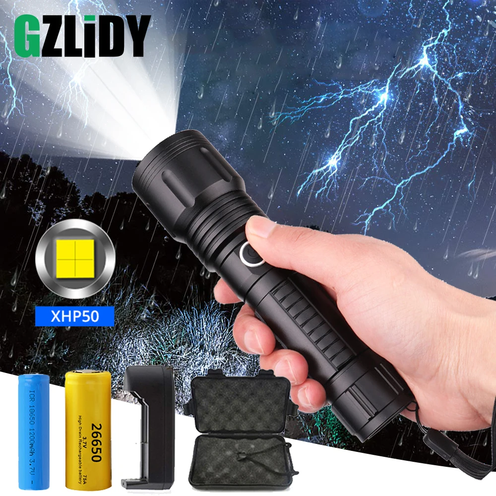 Powerful LED Flashlight Use XHP 50 Lamp Beads 5 Lighting Modes Zoomable Waterproof Torch Lighting D